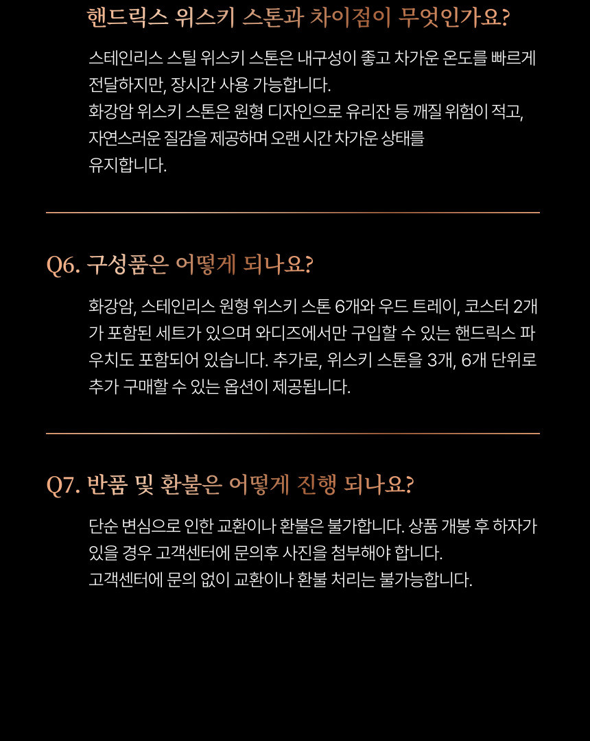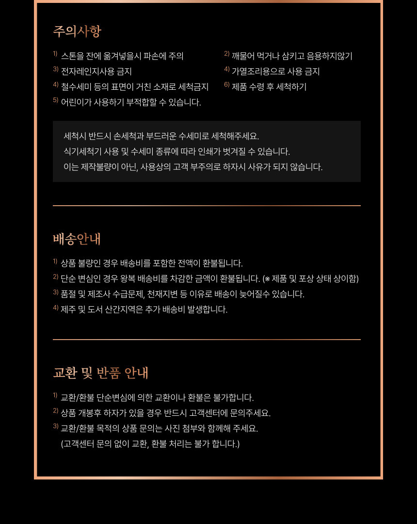 - 단순 변심에 의한 교환·반품 시 왕복 배송비 (8,000원) 는 고객 부담이며, 실제 발생 배송비로 청구됩니다.